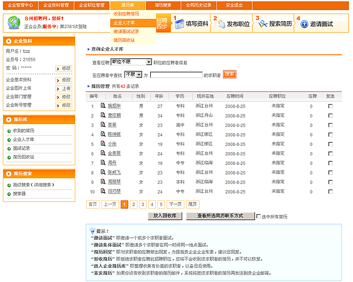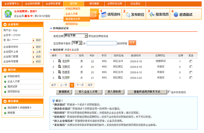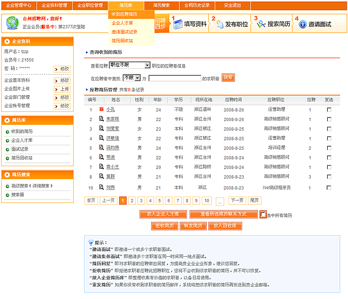 收到应聘简历:可以对收到应聘者的简历进行搜索,并对其相应的操作