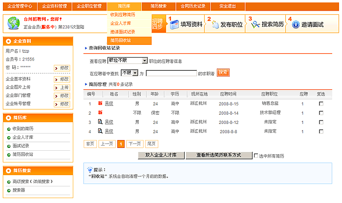 简历回收站:把认为不需要的人才删除到回收站,还可以从回收站恢复到企业人才库